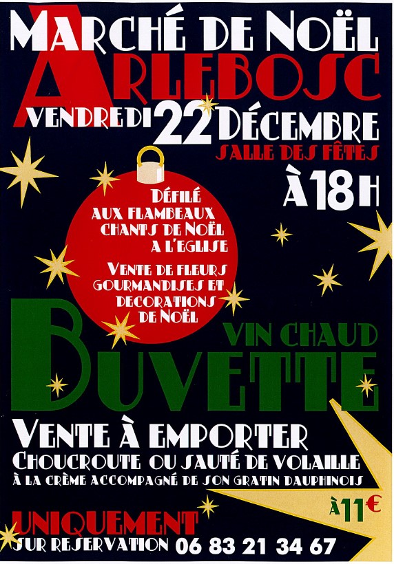 Les enfants de l’école d’Arlebosc, vous invitent à partager un moment convivial avant Noël, le vendredi 22 décembre à partir de 18h!!!!(retraite aux flambeaux, chants, vente de fleurs, décorations de Noël…)